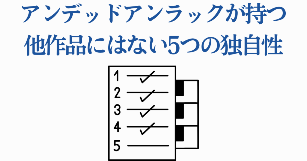 では逆に、アンデッドアンラックならではの“ここが唯一無二”と言えるポイントはどこなのでしょうか。代表的な独自性を5つに絞って整理してみます。