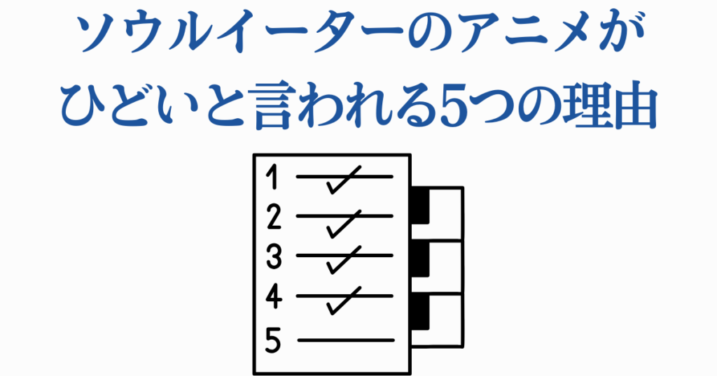 ソウルイーターのアニメについて、当時の掲示板などを見ると結構辛口な感想が並びます。ただ、その多くは感情的な罵倒ではなく、具体的なポイントに対する不満の積み重ねです。代表的な5つの理由を整理してみましょう。