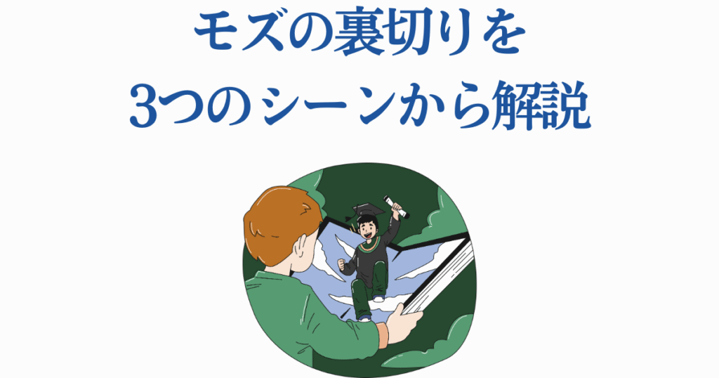 モズという人物の複雑さを理解するには、彼の行動の変遷を追うことが重要です。ここでは、モズの裏切りに関わる3つの重要なシーンを詳しく解説し、彼のキャラクター発展を時系列で追っていきます。