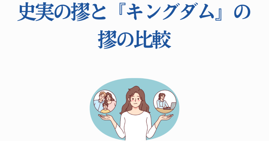 また、摎が昭王の娘であるという設定も『キングダム』独自のものです。史実の楊摎の出自や家族関係について詳しい記録は残されておらず、皇族との血縁関係を示す史料も存在しません。龐煖に討たれたという最期も創作であり、史実の摎がどのような最期を迎えたかは不明です。