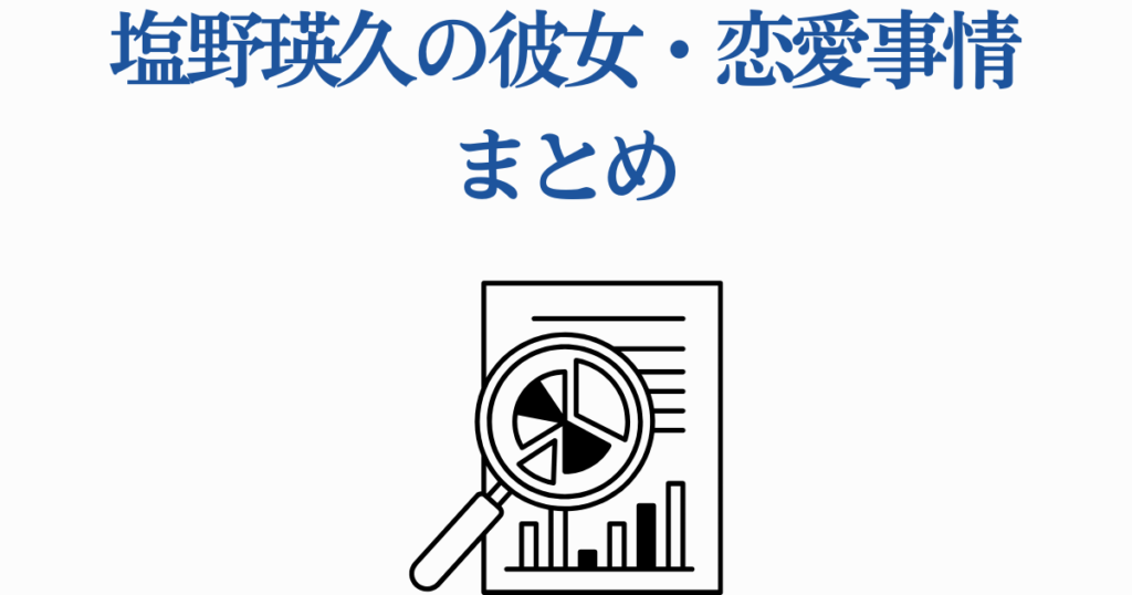 ここまで塩野瑛久さんの恋愛事情について詳しく見てきました。現在は彼女がいないと考えられる塩野さんですが、過去には今野鮎莉さん、永夏子さん、美山加恋さんという3人の女優との交際が噂されました。ただし、確実に交際していたと言える証拠があるのは、週刊誌に写真を撮られた永夏子さんとのケースのみで、他の2人については噂の域を出ません。